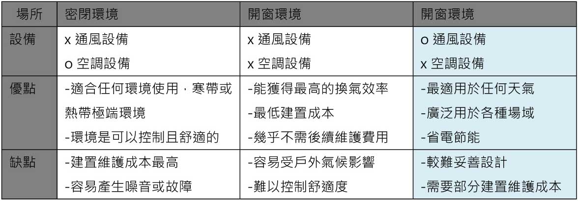 針對那些居家自我隔離或是在醫院被照顧的病人,保持室內空氣流通更是重要,WHO研究指出, 在病房內安裝多支吊扇有助於改善通風效果,而良好的通風則有助於降低疾病感染風險,以下簡單陳列常見的三種空間場域,並分析其各自的優劣勢,從此張比較圖可以看出,一個開放式的環境若能搭配適合的通風產品就能獲得最佳、最穩定的通風效果。